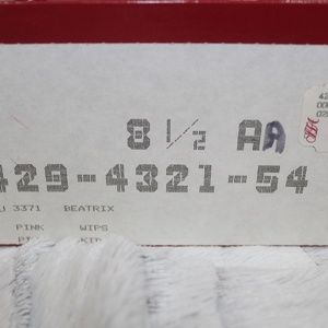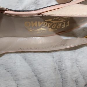 These are vintage shoes and are in very good condition, and they have the classic elegance Farragamo is known for. The original receipt is included. These shoes are open-toed with a slingback kitten heel. They are a lovely pair of shoes, and the open toed shoe has a pink accent. Come with original box