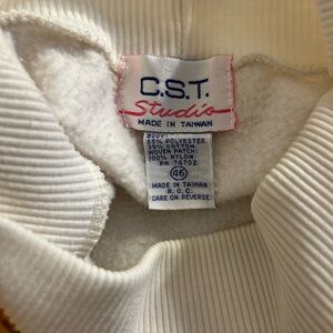 VTG C.S.T. STUDIOS PULLOVER WHITE/RED ORANGE/YELLOW/TURQUOISE/BLUE COLOR BLOCK SLEEVES NYLON RIBBED HEM & CUFFS FLEECE LINED CHEST 56” SLEEVES ARM PIT 21.75” LENGTH 28” HAS TINY SPOT ON FRONT GOOD VINTAGE CONDITION CS096