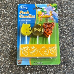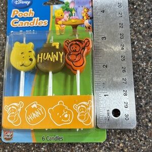 Set of 6 Disney Pooh character candles. Features yellow, brown, and orange designs. Perfect for themed celebrations.