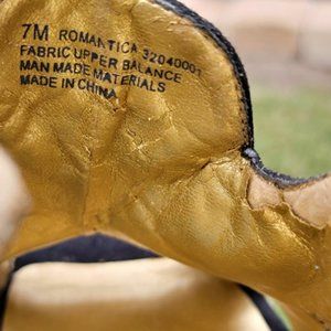 Inside gold color is flaking off. Underlying leather good shape. Purchased 16 years ago. Stored in clear acrylic shoe box.