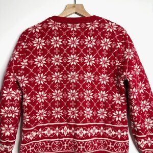 - Keywords: long sleeves, clasp closure, fully lined, snowflake print, Christmas sweater, red and white, ski, vintage, Nordic style