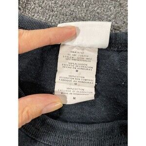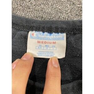 Please measure your favorite garment and compare to insure a good fit.The Vintage Champion Shirt is a classic black short sleeve crew tee made of cotton, featuring a solid pattern with the Champion logo as accents. This regular fit T-shirt is designed for men in size medium, with a 90s theme that adds a retro touch to the overall look. Made in Honduras, this double-sided shirt is a stylish addition to any streetwear collection, perfect for those who appreciate vintage fashion and quality craftsmanship.