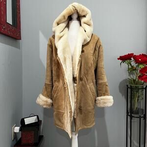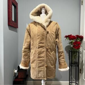 Gorgeous Vintage 90s Suede Faux Sherpa Hooded Longline Whipstitch Oversized Warm Cozy Winter Car Over Coat by Charles Klein. Toggle Closure Button Front. Side Slant Pockets. Inside Zipper Pocket. Adjustable and Foldable Sleeve Cuffs. Plush. Tan/Light Beige Suede. Cream Faux Fur Sherpa. Women’s Size XS. Runs Slightly Large. See Measurements.
