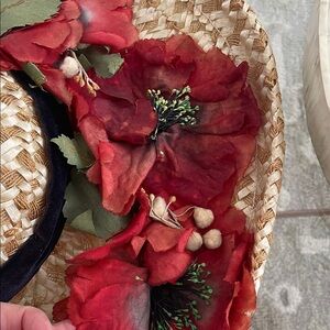 Enhance your style with this chic straw hat, featuring bold red poppy floral accents and a sleek black or navy ribbon. Perfect for any occasion. Great vintage condition for its age. No holds in the straw a little faded and the flowers can use some steaming. Sold in as is vintage condition please see pictures for further details.