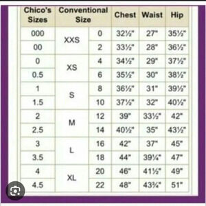 Very good condition, no flaws, some wear; this is an older Chico’s piece. Size chart in pics.
