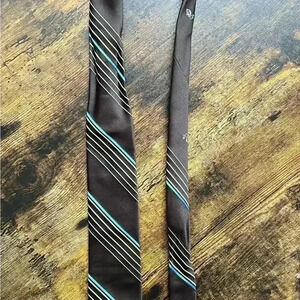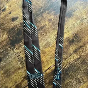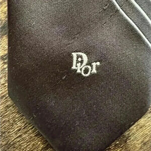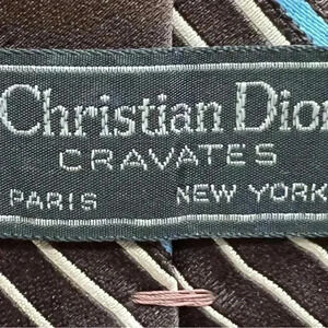VINTAGE: Christian Dior New York Cravates men’s polyester tie. Colors: chocolate brown, off white, light blue. Length: 55” Width: 3”. Dior logo embroidered on 3 spots throughout the tie. From bambergers mens store, a store in the northeast that went out of business in 1986, so this tie is pre-1986. Very good condition.