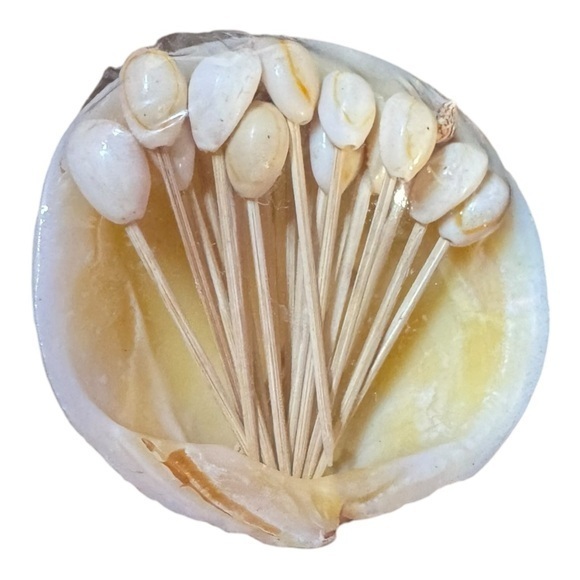Enhance your dining experience with this elegant natural shell toothpick holder. Its cream and tan hues add a touch of coastal charm to any table setting. VINTAGE Clam Shell With 23 Toothpicks with Seashells Tips. HORS D'OEUVRES, CHEESE, Food, etc. NEW. Made in Phillipines. New in pack. Sealed. Old stock. Not sure on exact year. Beach theme, nautical, ocean, Pool party, cookout, BBQ, Tiki Bar, etc. Approx 3.25" x 3.25". I think I count 23. Not sure if the shells slip off and can be reused or not. Great to use or display as decor. A little wear on the back plastic. See photos. Any questions please ask. Thanks for looking!