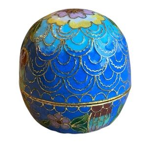 VINTAGE Chinese Blue Floral Cloisonné Enameled Brass Owl Jewelry Trinket Box Decor Measures: 2” x 1.5” Colors: Shades of Blue, Shades of Green, Cinnamon Brown, Marigold, Lavender, Gold, Creamy White Comes w/ Wooden Stand option Adorable All Around