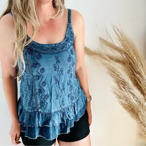 VINTAGE Cute Options Blue Denim Chambray Embroidered Ruffle Tank Top Blouse M