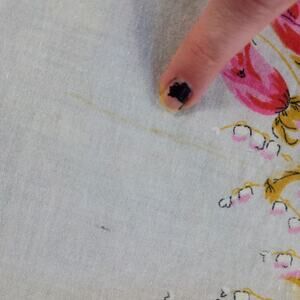 THE TRIM HAS THE CUTEST PINK DETAILS. I LOVE THE FLORAL PRINT AS WELL. THERE IS A SMALL STAIN THAT CAN BE SEEN IN THE PHOTOS ABOVE