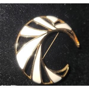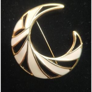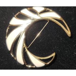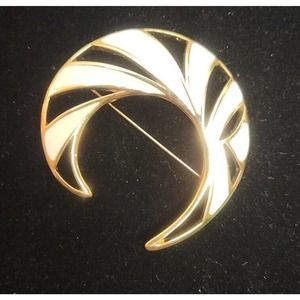 VINTAGE DECO MONET HALF MOON BROOCH PIN White Enamel on Gold-tone Alloy