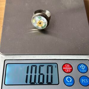 BEAUTIFUL SUPER UNIQUE DESIGNER JESSICA LEE MADE VINTAGE RING WITH A DELICATE FLOWER PAINTING ON THE CERAMIC . THE RING FACE IS APPROX. 16MM IN DIAMETER, SITS BETWEEN SIZES 6 AND 6.5 ON RING MANDREL, THE BAND IS APPROX.6MM WIDE AND THE RING WEIGHTS 10.58 GRAMS. IT IS STAMPED WITH DESIGNER HALLMARK.THERE IMPERFECTIONS WITH IT (AS EXPECTED WITH MOST VINTAGE ITEMS) : BEND IS SLIGHTLY BENT (AS SHOWN IN PICTURES), SOME SCRATCHES, BUT THIS IS SUCH A BEAUTIFUL , CHEERFUL, HAPPY LOOKING RING THAT IT DOES NOT REALLY TAKE AWAY FROM ITS BEAUTY .NOT TO MENTION THAT THIS RING IS SO UNUSUAL !!!