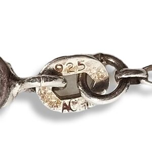 Unique vintage artisan made necklace featuring a bold lime green and dichroic art glass pendant on a sterling silver chain. Chain also has a crescent shaped pendant at center that bale of art glass pendant sits neatly on. Chain measures 16-1/4 inches in length and is stamped 925 on a couple of different spots on chain closure. Pendant measures 1-3/4 inches tall and 5/8 inches wide. Great piece in great condition.