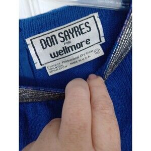 This vintage sweater dress by Don Sayres for Wellmore is a unique piece with a touch of 1980s flair. The dress features intricate blue beaded 3D bows on the sleeves, adding a playful and eye-catching detail to the overall design. Made in the United States, this knit dress in a size 12 is perfect for an evening occasion, combining a stylish blue color with a comfortable regular fit. Perfect for those looking to make a statement with a vintage piece that stands out from the crowd.