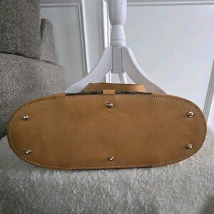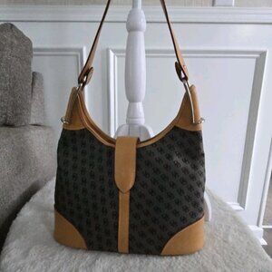 Dooney & Bourke vintage signature classic jacquard logo print and tan leather crescent hobo shoulder bag.