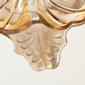 ELEVATE YOUR VINTAGE GLASS COLLECTION WITH THE JEANETTE DORIC IRIDESCENT, MARIGOLD COLORED DEPRESSION CARNIVAL GLASS DISH. CRAFTED WITH METICULATE ATTENTION TO DETAIL, THIS DISH IS A RADIANT EXAMPLE OF VINTAGE GLASS ARTISTRY THAT SEAMLESSLY BLENDS FUNCTIONALITY AND AESTHETICS. THE DISH'S IRIDESCENT MARIGOLD HUE ADDS WARMTH AND NOSTALGIA TO ANY SETTING. DIVIDED INTO THREE SECTIONS, THE