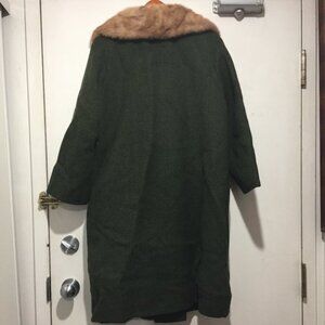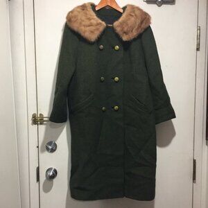 Vintage Double Breast Wool Mink Long Coat, No Label Fits a Medium, Color Green, Brown, Thick Heavy Wool, Real Mink Collar, Lining, Side Pockets, Closure Buttons, Buttons Loose but in Good Condition, It is a Beautiful Coat and a great Look, Great Fitting.
