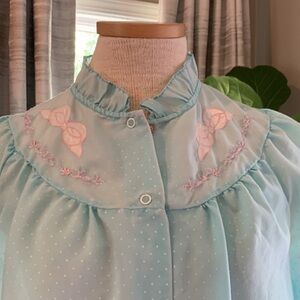 Vintage Dan & Ellen snap closure light blue with pink accent housecoat. Size has worn off but I’d say its closer to a small to medium. Measurements included. Has pockets. Ruffle around neck and sleeves. A couple of spots on backside. Refer to pic.