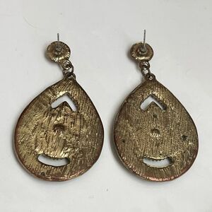 Turquoise, lime green and gold seed beads set in a teardrop shape gold-tone metal setting. Green rhinestone posts.