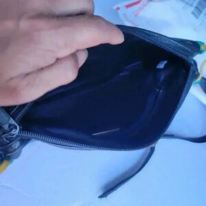 This beautiful Danielle Nicole handbag is a must-have for any fashion-forward woman. With a unique mix of colorful animal print and black leather, this crossbody bag is perfect for any occasion, whether you're traveling or just running errands. The bag has a medium size, measuring 10 inches in width and 7 inches in height, making it the perfect size for carrying all your essentials. The bag features a black leather cross-body strap and a gold-plated zipper closure, adding a touch of elegance to the overall design. The interior lining is made of black fabric, providing a soft and protective surface for your belongings. This vintage bag is a true statement piece and is sure to turn heads wherever you go.