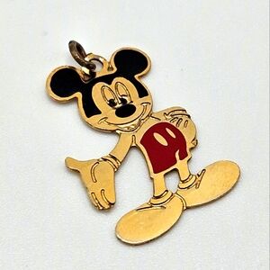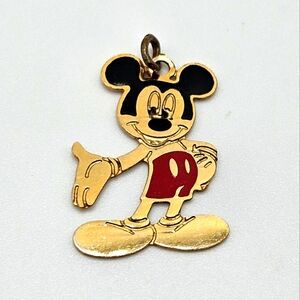 Vintage Mickey Mouse pendant. Gold-tone metal with color details on front. Marked Disney on back. Hanging loop to add to a chain or charm bracelet. Measures about 1" long. Excellent condition and smoke-free home.