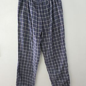 These are vintage Disney men's pajama pants in size L featuring Winnie The Pooh and Eeyore characters. Made of 100% cotton flannel with a plaid pattern in multicolor. The pants have a drawstring closure and are machine washable. They are ideal for winter, summer, fall, and spring seasons and are not handmade.