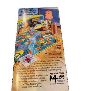 This lot includes a pre-owned VHS tape of Disney's Snow White and the Seven Dwarfs, a Nestle Quik game board, and a business reply mail envelope. The VHS tape is in good condition with minor wear and tear. The game board is in excellent condition with no visible damage. The business reply mail envelope is in good condition with no visible damage. The VHS tape is approximately 7 inches long and 4 inches wide. The game board is approximately 12 inches long and 9 inches wide. The business reply mail envelope is approximately 6 inches long and 4 inches wide. The VHS tape is made of plastic and paper. The game board is made of cardboard and paper. The business reply mail envelope is made of paper. The VHS tape features a picture of Snow White and the Seven Dwarfs on the front. The game board features a picture of Pocahontas on the front. The business reply mail envelope features a picture of Mickey Mouse on the front. The VHS tape is a pre-owned item and may have some minor imperfections. The game board is a pre-owned item and may have some minor imperfections. The business reply mail envelope is a pre-owned item and may have some minor imperfections.