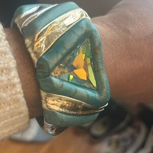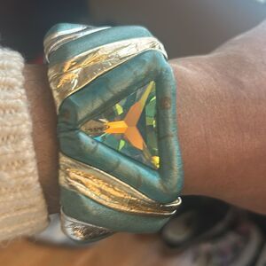 VINTAGE Duane Fitzgerald Leather Cuff Bracelet Turquoise Gold Silver Rocker Glam