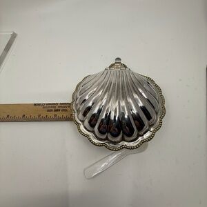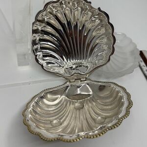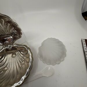 This is my grandmothers vintage Circa 1920's E & J Leek silver plate clam shell butter/caviar or condiment dish with a frosted glass insert. (and faux mother of pearl spoon) Made in England, Slight tarnishing . Gold tone beading around edge. Glass insert in pristine condition.