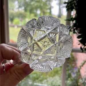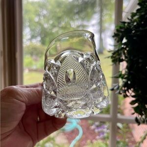 VINTAGE, EAPG, HEAVY CUT GLASS CREAMER FROM NEW HAMPSHIRE GLASS. TIME HAS FADED THE GOLD FROM THE TOP, BUT, STILL A BEAUTIFUL PIECE. 3”H X 2 3/4” BASE.