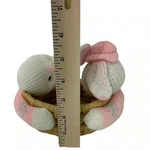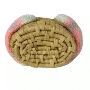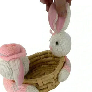 This vintage Easter rattan weaved basket, measuring 6 inches, features plush knit bunnies holding the basket, adding a charming and nostalgic touch to your holiday decor. The finely woven rattan provides a rustic and timeless appeal, while the adorable knit bunnies bring a playful and whimsical element. Perfect for displaying Easter eggs, candies, or as a decorative centerpiece, this basket is a delightful addition to your seasonal celebrations, evoking the joy and tradition of Easter.