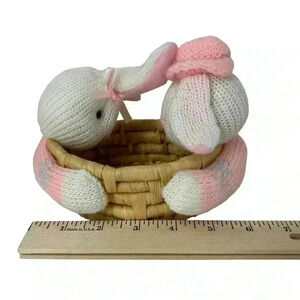 VINTAGE EASTER RATTAN WEAVED BASKET PLUSH KNIT BUNNIES HOLDING BASKET 6”