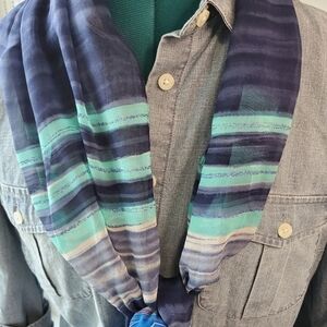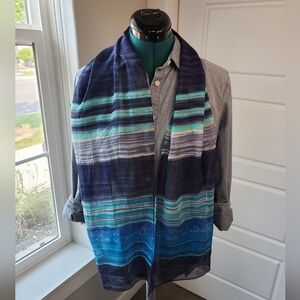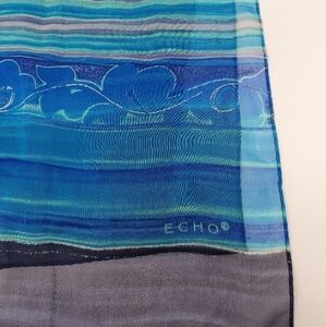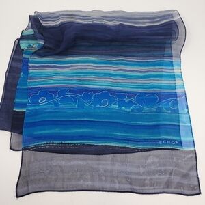 VINTAGE ECHO SHEER OBLONG SCARF NAVY BLUE PEACOCK TEAL SRIPES FLOWERS WOMEN OS