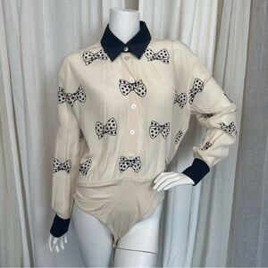This Escada bodysuit is in good vintage condition. 100% silk featuring a bow coquette print. Cream and black with a satin collar. Women’s size 40/8. There is a light mark in the bottom section of the bodysuit (pictured).