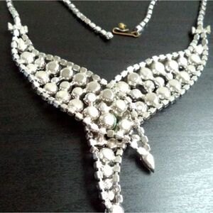 This is a stunning vintage mid-century modern (MCM) high-end rhinestone necklace, perfect for a statement or runway look. Measuring approximately 15 5/8 inches, it features a dazzling array of rhinestones arranged in a bold and intricate design that tapers to a pointed, angular shape in the center. The rhinestones are set closely together, creating a cohesive, sparkling effect, with larger stones in the center surrounded by smaller ones. The chain also showcases rhinestones, adding continuity to the piece. This necklace would be ideal for special occasions or for adding a touch of vintage glamour to any ensemble.