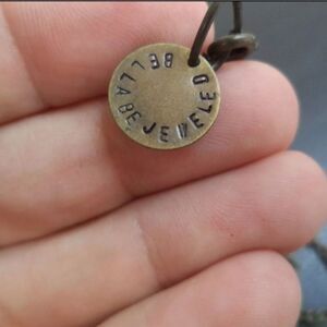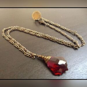 This stunning vintage estate necklace features a beautifully faceted glass pendant in a deep ruby red shade. The pendant is wrapped in brass wire, giving it a unique and handcrafted feel. The necklace chain is approximately 17 inches long and consists of twisted brass links that add an antique touch to its design. A small, round, signed "Bella" tag is attached near the clasp, adding authenticity and charm to the piece. This elegant piece would make a sophisticated addition to any vintage jewelry collection, perfect for adding a pop of color and character to both casual and formal outfits.