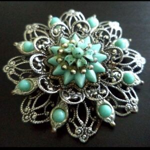 The image shows a beautifully intricate brooch or pendant that features a filigree design. The metal framework appears silver in color, with delicate, lacy patterns forming a flower-like structure. At the center, there is a layered floral design made up of turquoise or aqua-colored beads and stones. The central flower is formed by small spiked petals surrounding a core of round beads, giving it a striking three-dimensional appearance. Around the edges, additional turquoise-colored beads are set into the silver filigree, enhancing the overall ornate look. The combination of turquoise and silver creates a vintage, elegant aesthetic, typical of antique or artisan jewelry.