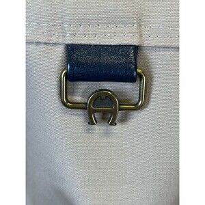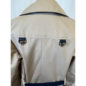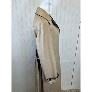 This Etienne Aigner Classic Reversible Rain Coat in a stylish navy and tan color combination is a must-have for women looking for a versatile outerwear piece. The coat features a belted waist for a flattering silhouette, along with a buckle and logo accents that add a touch of sophistication to the design. NOTE; SEE PHOTOS FOR SMALL SPOT ON TAN AND ALSO BELT HAS SOME STAIN THAT I FEEL WILL COME OUT WHEN WASHED. MAY HAVE BEEN FROM FLOOR DIRT. SEE PHOTOS FOR MEASUREMENTS. SEEMS TO BE A SMALL TO MED SIZE