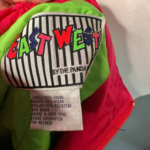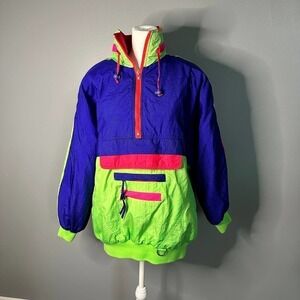 Good vintage condition. Shoulder pads. Fluorescent highlighter colors. Zipper has damage and we filed a bit but still enough to hold. There is definitely some color bleed on light colors and marks on the sleeves due to age of the jacket.