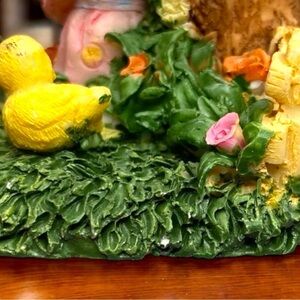 Adorable vintage Easter-themed decorative figurine featuring two rabbits, a birdhouse, and charming springtime details!