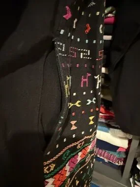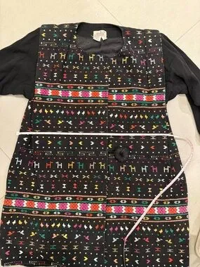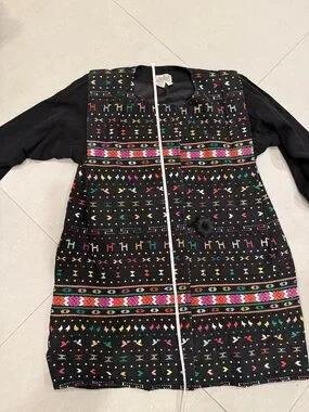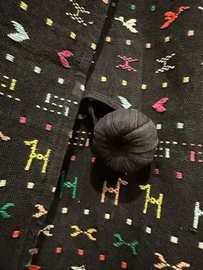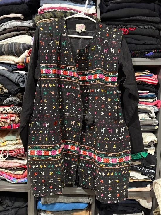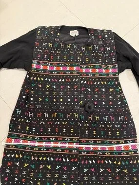 Stunning vintage jacket with vibrant embroidered geometric and folk-inspired motifs. Multicolor accents in pink, green, yellow, red and orange. Front knot button closure. Lightweight layered look. Bold, artisanal style for layering.