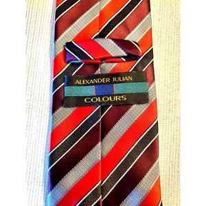 VINTAGE Executive Power Tie COLOURS BY ALEXANDER JULIAN New Old Stock Excellent Add a touch of vintage sophistication to your wardrobe with this stunning Colours by Alexander Julian Executive Power tie. The striking red Silver Black Stripes and vivid colors will add a pop of boldness to any outfit, while the classic neck tie style ensures timeless elegance. Perfect for formal events or adding some flair to a casual look, this vintage accessory is a must-have.