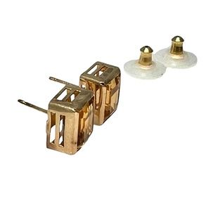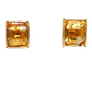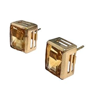 Vintage faceted yellow stone bezel set gold tone rectangle stud earrings. The stones are set in shiny gold tone that has a cut out lines on each side. The stones are faceted and vary from brighter yellow to deeper almost amber depending on the light. I don't know whether the stones are semi precious or something else. They look like citrines. There are some small scratches from wear. In very good preowned condition.