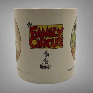 Vintage 1983 Bil Keane Family Circus coffee mug. “I like reading. It turns on pictures in your head”, “Wait a minute, mommy. I want to see this commercial”. No cracks or chips but does have wear, please refer to pictures. (Shadow of phone in pictures)