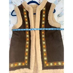 VINTAGE ESTATE ITEM - FAUX SUEDE VEST IN CHOCOLATE BROWN WITH FAUX SHEARLING LINING AND EMBROIDERED TRIM. MEASUREMENTS IN PHOTOS. EXCELLENT CONDITION. CABINCORE, GORPCORE, SUSTAINABLE.