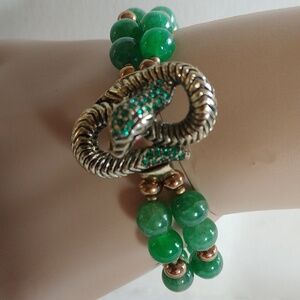 VINTAGE FAUX GREEN JADE SNAKE BRACELET 8" LONG DOUBLE STRANDS FAUX DIAMOND CLASP