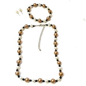 -Vintage Faux Pearl Gold Black Beaded 17-21"Necklace Stretch Bracelet Earring Set.
