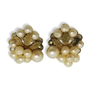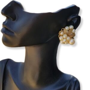 Beautiful vintage cluster style earrings most likely made in west Germany. Earrings have a goldtoned filigree design back with faux pearls and goldtoned leaf designs, earrings are also accented with a single austrian crystal.  Earrings measure 1-1/4 inch tall and 1 inch wide.  They have clip on backs and are in overall good condition however there is a dark tarnish spot on one of the leaves of one earring and the faux pearls have some peeling on the surface as seen in close up pics.