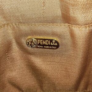 VINTAGE FENDI S.A.S ZUCCA HAND WOVEN CROCHET WITH GOLD METALLIC NYLON DRAW-STRING INSERT SHOULDER BAG WITH FRINGED BOTTOM LEATHER HANDLES & EMBOSSED FENDI ROMA 1925 LOGO FENDI SIGNATURE MONOGRAM NYLON INTERIOR WITH 2 SLIP POCKETS. MADE IN ITALY # 16 14228 02
