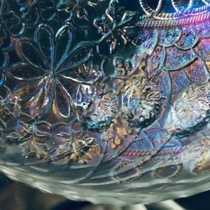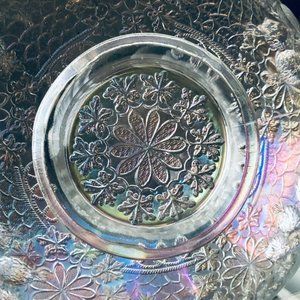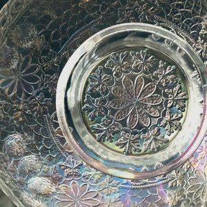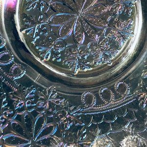 RECENTLY 6/2025 FOUND THAT THIS IS A FENTON LEAF CHAIN WHITE IRIDESCENT CARNIVAL GLASS - MARKETED AS IRIDIL GLASS beginning in 1907 4 other glass makers also produced this type of glass .